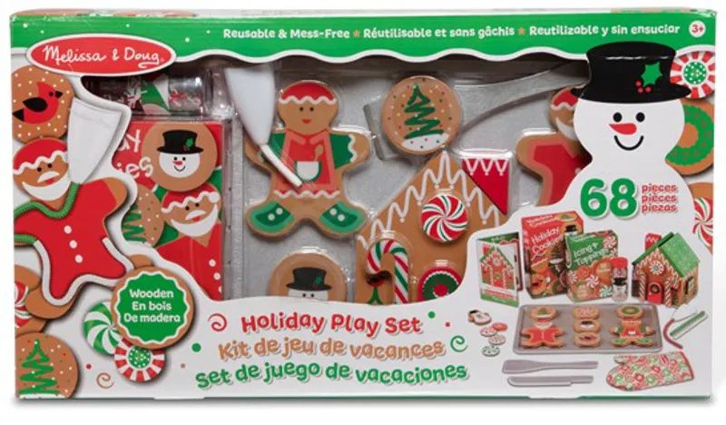 This Melissa & Doug Deluxe Holiday Baking Set is everything kids need to build their own wooden gingerbread house and decorate wooden cookies.